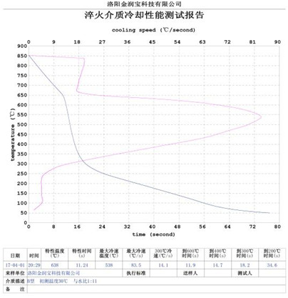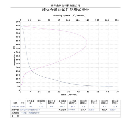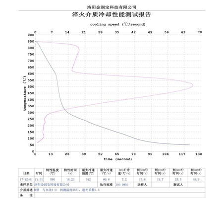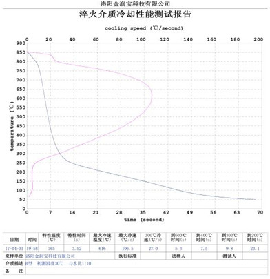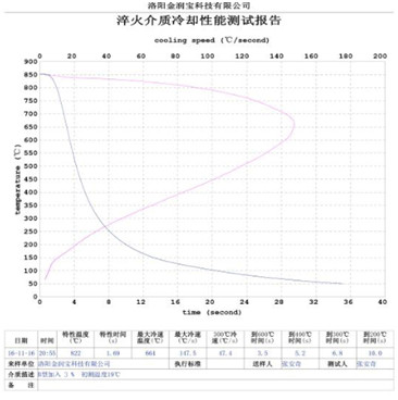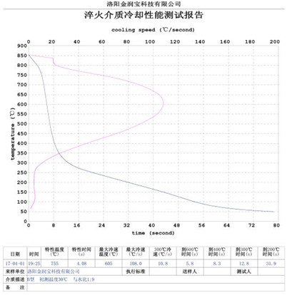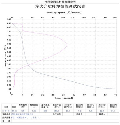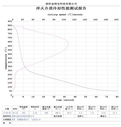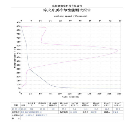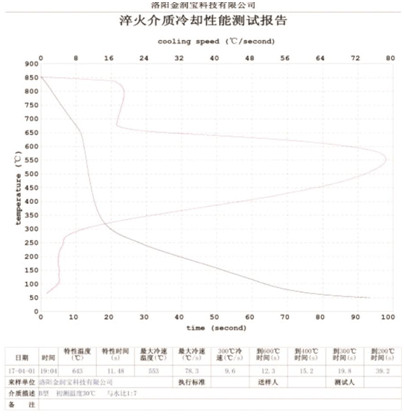 本產(chǎn)品無色或淡黃色透明液體,PH值為7。原液與水配比1:4~1:20之間。當(dāng)原液與水配比為1:4~1:9之間時(shí),可完替代慢速淬火油、中速淬火油和高速淬火油。原液與水配比為1:4~1:5時(shí),與慢速淬火油的冷卻性接近;原液與水配比為1:6時(shí)的水溶液的冷卻性與光亮中速淬火油的性接近;原液與水配比為1:8——1:9時(shí)的冷卻性與高速淬火油的性接近。